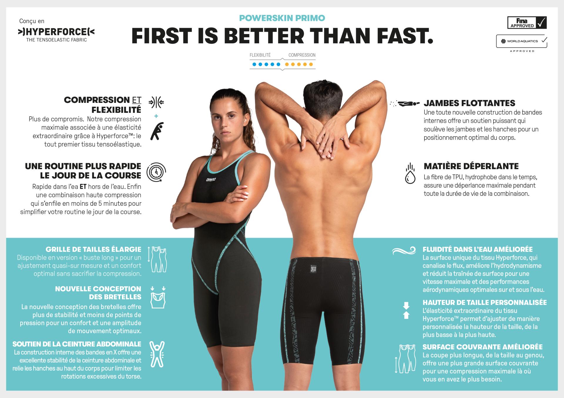 Toutes les distances. Chaque évènement. Primo offre la meilleure technologie, la meilleure compression et la meilleure liberté de mouvement à TOUS les nageurs.